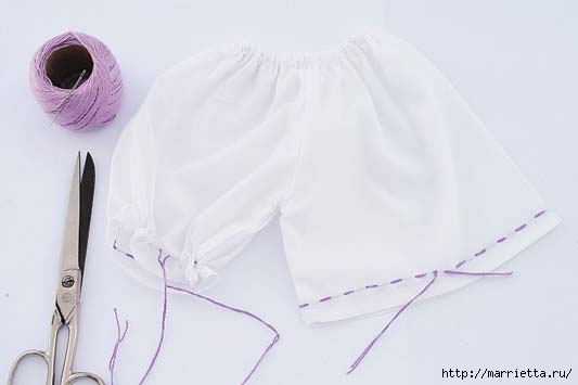 Com a agulha e linha de bordar lilás, faça um ponto de alinhavo no decote do vestido, deixando as sobras da linha se encontrarem ao centro. Com a agulha e linha, pesponte a barra do vestido.