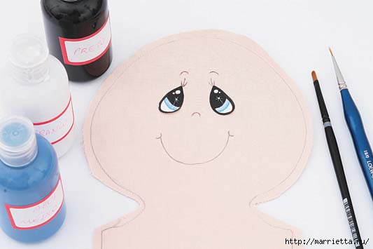 Faça o desenho do rosto e pinte antes de costurar, use caneta permanente para fazer os olhos e pincel nº 1 para os traços finos