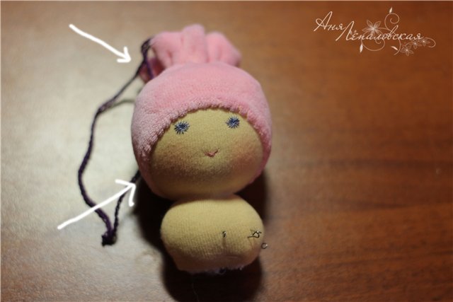 Aplique a touca e passe a alça pelo buraco da touca, marca com alfinete o lugar de olhos e boca
