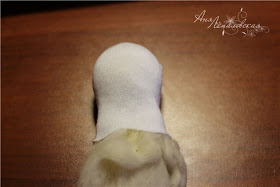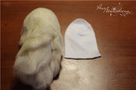 Fica assim como mostra a figura, corte uma meia pequena e use a ponta para ensacar a bola de linha e a lã desfiada