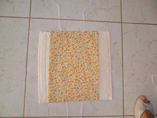 Primeiramente você corta o tecido um pouco maior que o centro da toalhinha e passa vincando onde ira costurar.