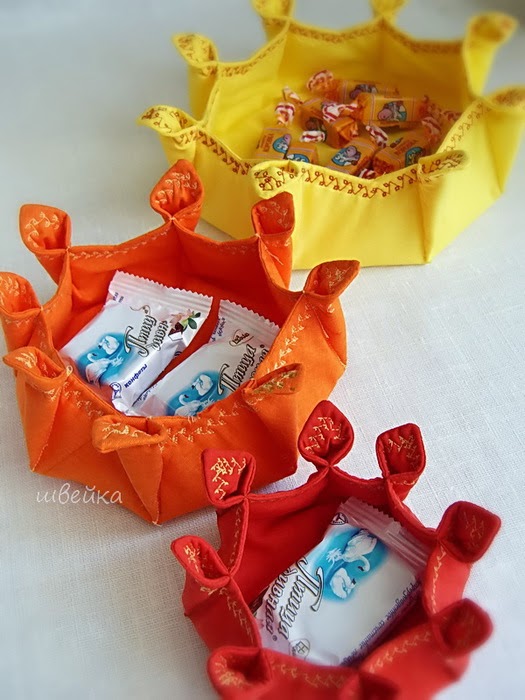 Ideia boa para usar até mesmo como lembrança de festa, pequenas "travessas" de tecido que podem ser sobrepostas e virar um enfeite de mesa.