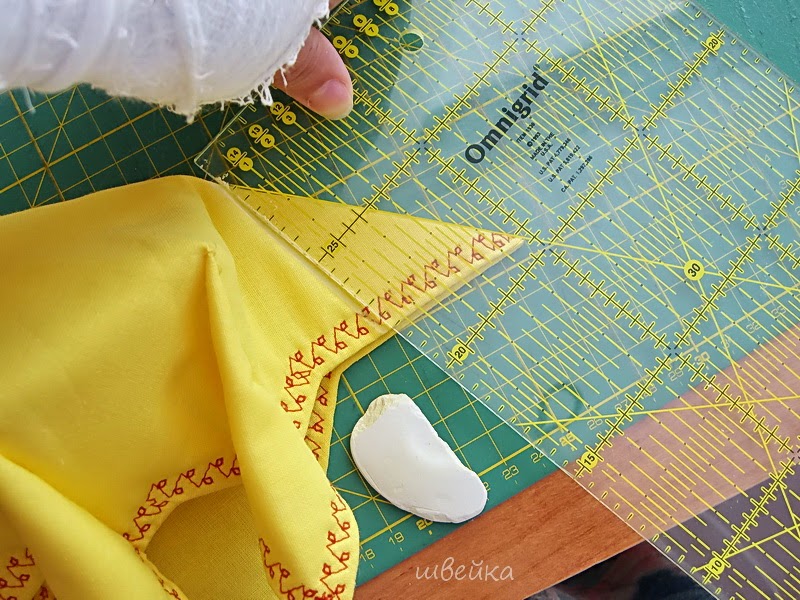 Arremate as beiradas com uma costura em detalhes, como bordado e dobre as pontas num ângulo de 30 graus aproximadamente.