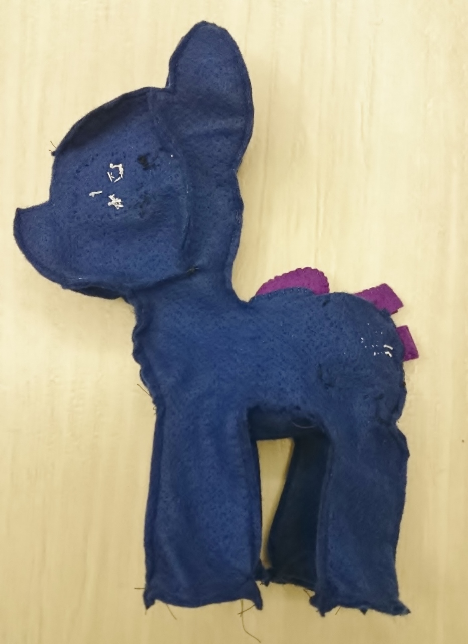 Prega-se com pontos invisíveis o chifre, a crina e os demais adereços.