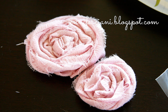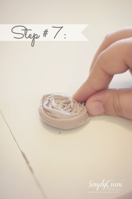 Tome uma tira individual de tecido e bola até uma das extremidades do tecido por beliscar o tecido entre o polegar eo dedo indicador, em seguida, enrole a tira de tecido em torno dele. Você vai começar a ter uma pequena olhada roseta que você mantenha beliscar o tecido e torcendo-o em torno de si (como um bolo de canela). Depois de ter o começo de roseta, fazer uma pequena bagatela de cola quente e coloque o tecido sobre ele.