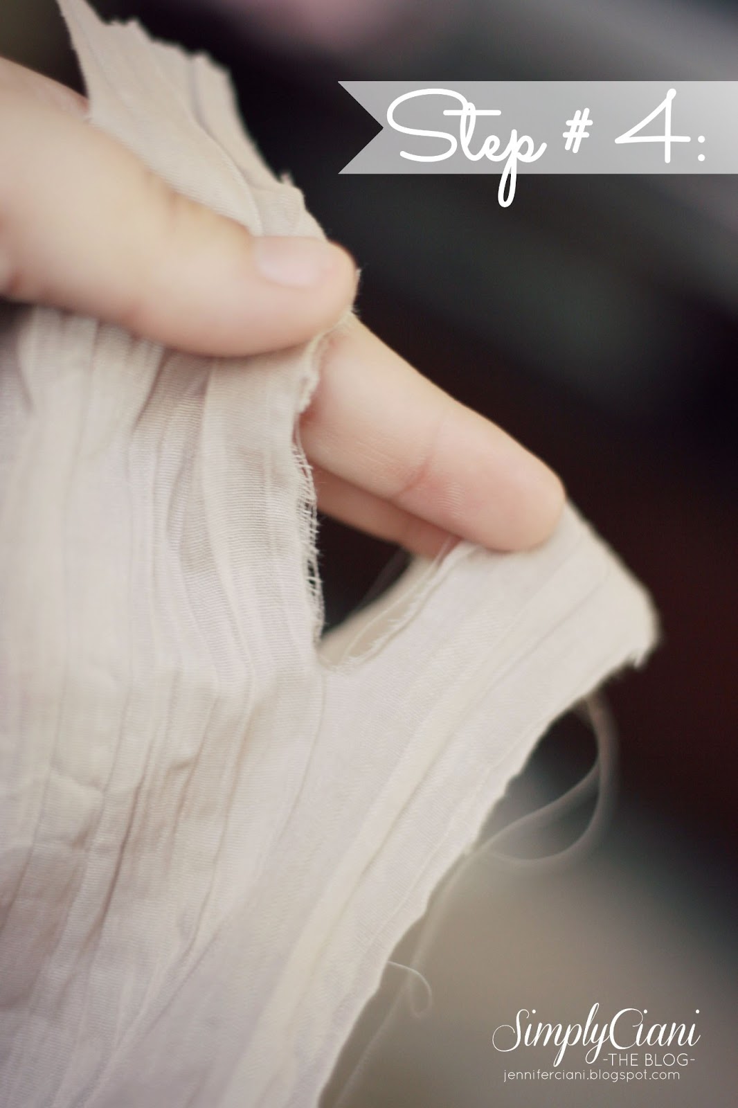 Etapa # 3 e # 4:Separe e começar a rasgar o tecido, mantendo a maior porção do tecido com a mão esquerda e rasgando a tira com a mão direita. Quando você cortar tecido longitudinalmente, naturalmente lágrimas em uma linha reta, uma vez que está acontecendo com o costuras / thread.