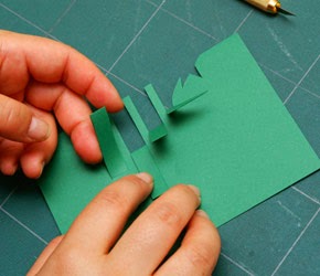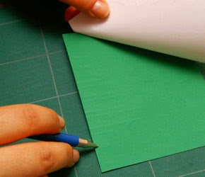1 - Dobre a folha verde ao meio.Com o modelo em cima do papel verde, risque os traços com a caneta sem tinta e a régua. Corte com gilete os traços marcados no papel.
