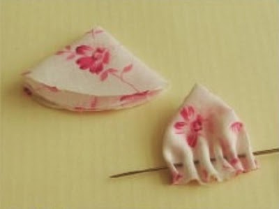 3° - Coloque linha em uma agulha (dobrada e com um nó no fim, como se você fosse costurar). Costure o círculo dobrado alinhavando, como na figura, deixando franzir mesmo e não costurando reto. Quando mais espaçados os pontinhos, mais franzidinha a flor fica e assim, você evita o aparecimento de um buraco muito grande no miolo.