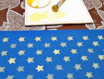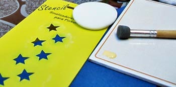 De leve – muito leve – molhe um pouco o batedor de estêncil na tinta. Veja que o batedor nada mais é do que um pauzinho com espuma na ponta.