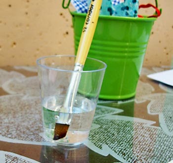 Primeiro, coloque o pincel chanfrado dentro do potinho de água e espere sair todas as bolinhas de ar para que as cerdas fiquem totalmente molhadas.