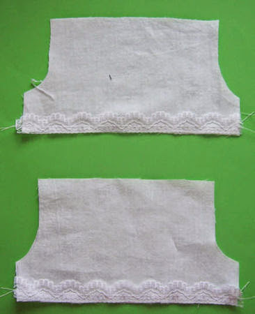 Em um dos lados grandes, costure um pedaço de renda, coloque versus lugar