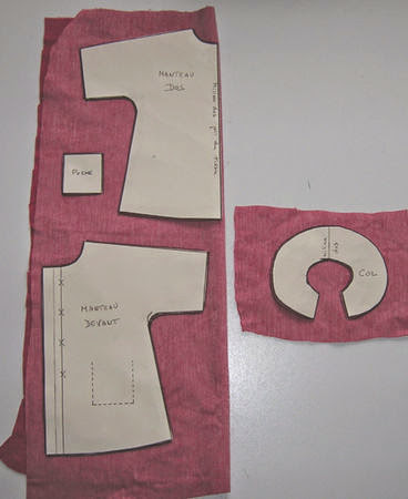 Sobre o tecido de sua escolha (46 cm X 36 cm) dobrada ao meio, coloque as peças padrão como este: é o centro da frente na dobra do tecido, a gola é cortado em viés