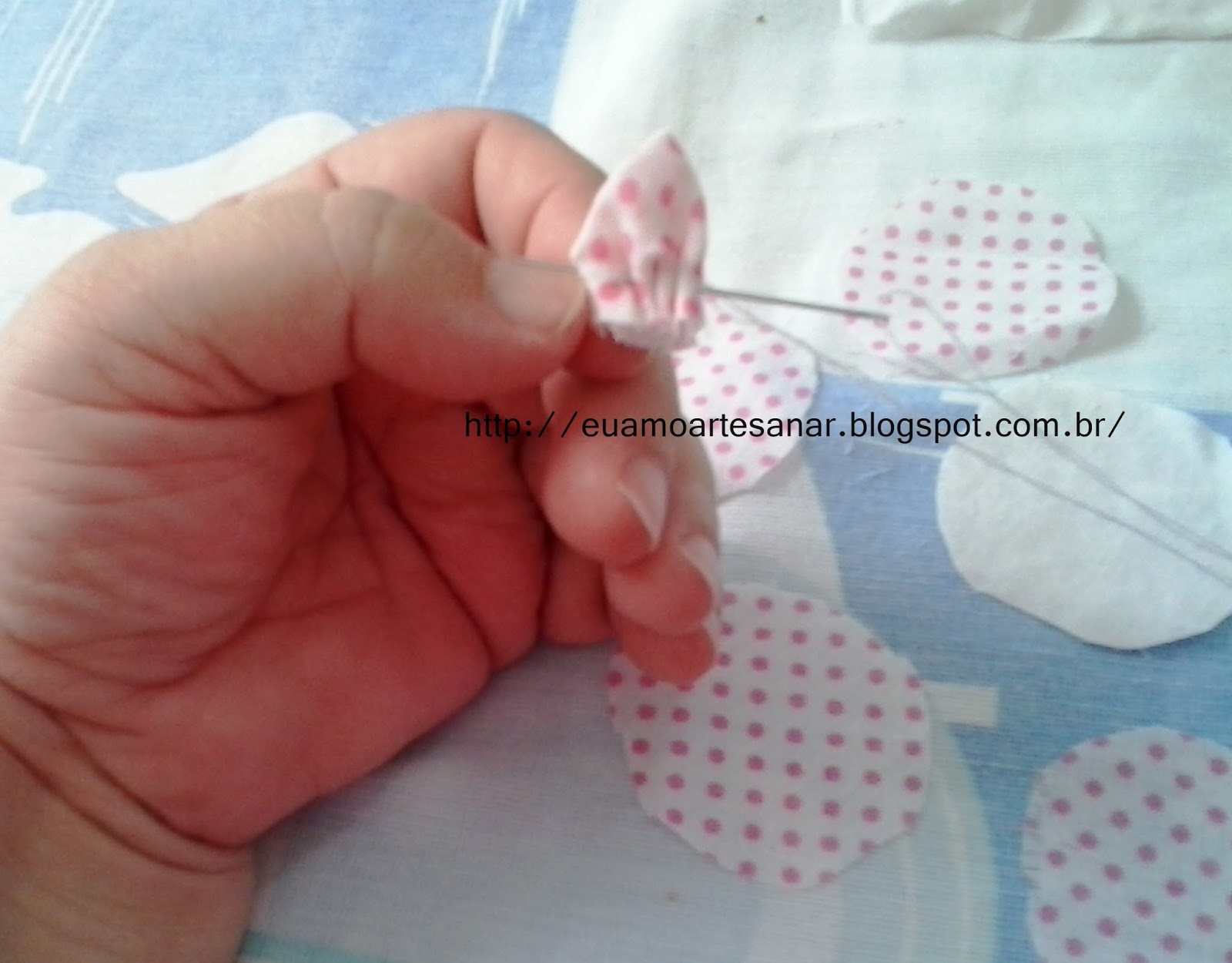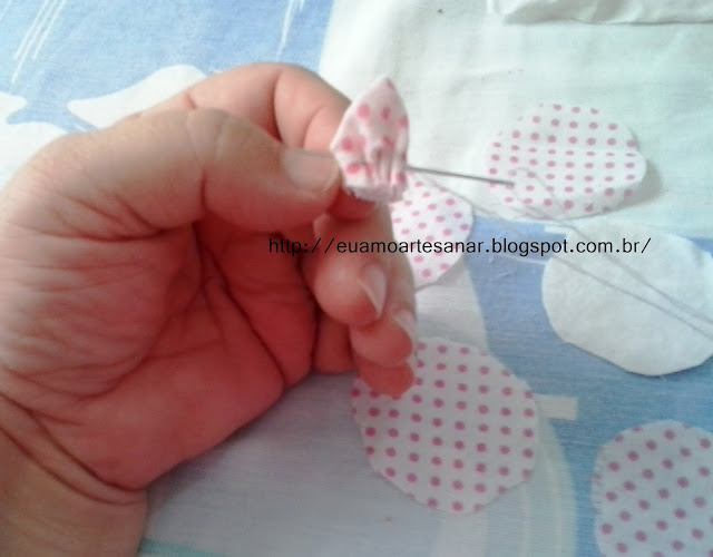 E costure com a mesma agulha e linha, pelas pontinhas da primeira e última pétala, juntando todas, puxando bem a linha(mas com cuidado para não quebrar a linha, senão terá que fazer tudo de novo)
