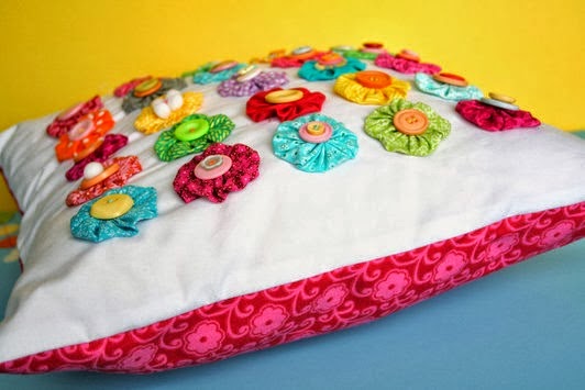 Depois de colocar todos os fuxicos no seu devido lugar, você pode alinhavar cada fuxico, um de cada vez na frente do travesseiro.