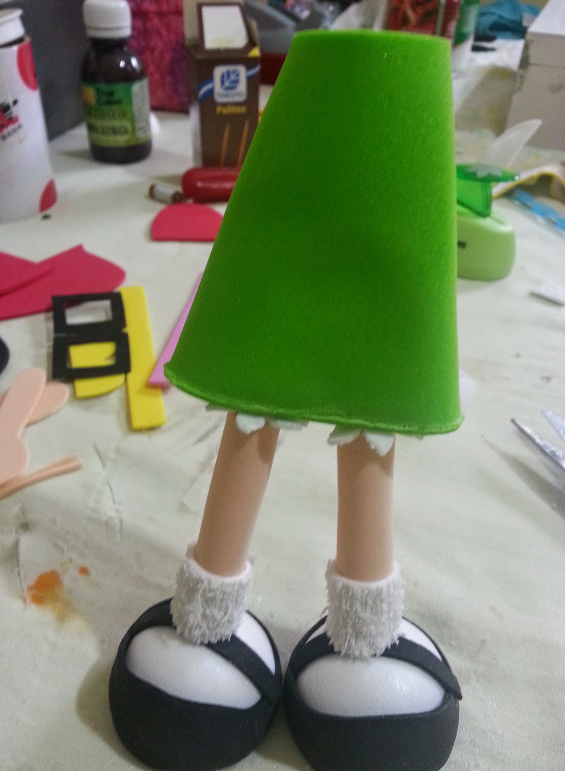 Materiais Necessários: EVA nas cores amarelo, marrom, branco, preto, vermelho, azul claro, caixinha de leite, cola instantânea, tesoura, caneta permanente preta, palito de churrasco, fita cetim amarela.