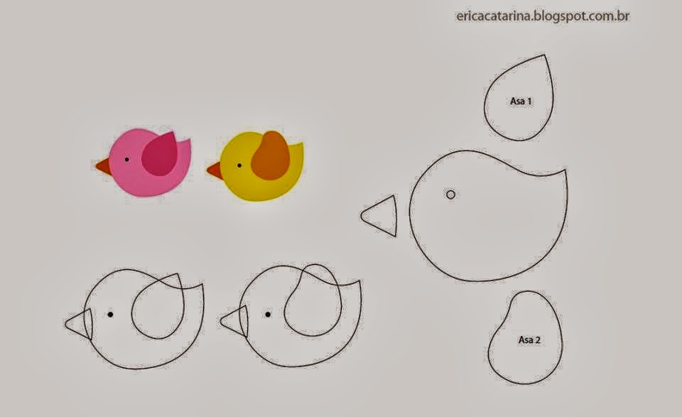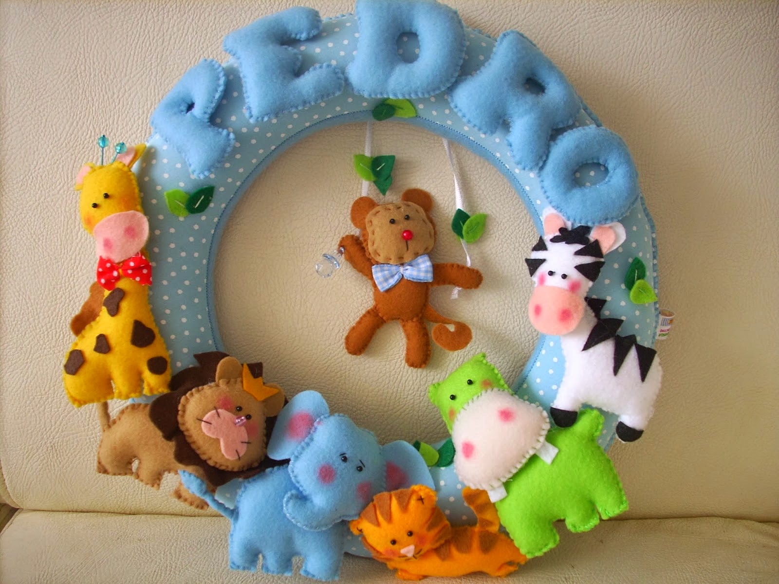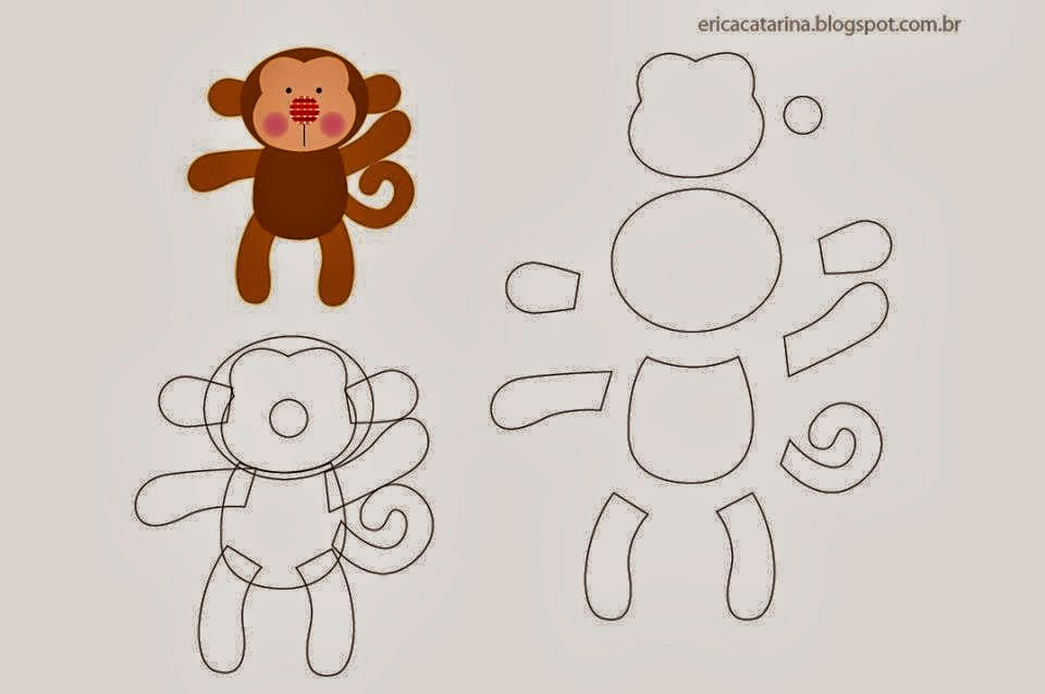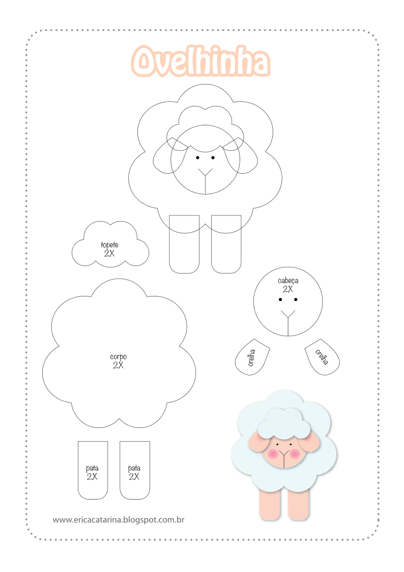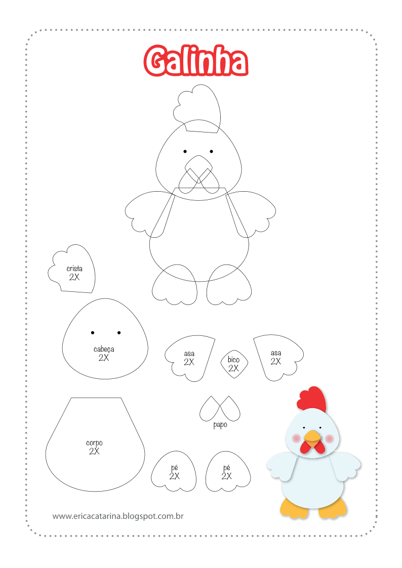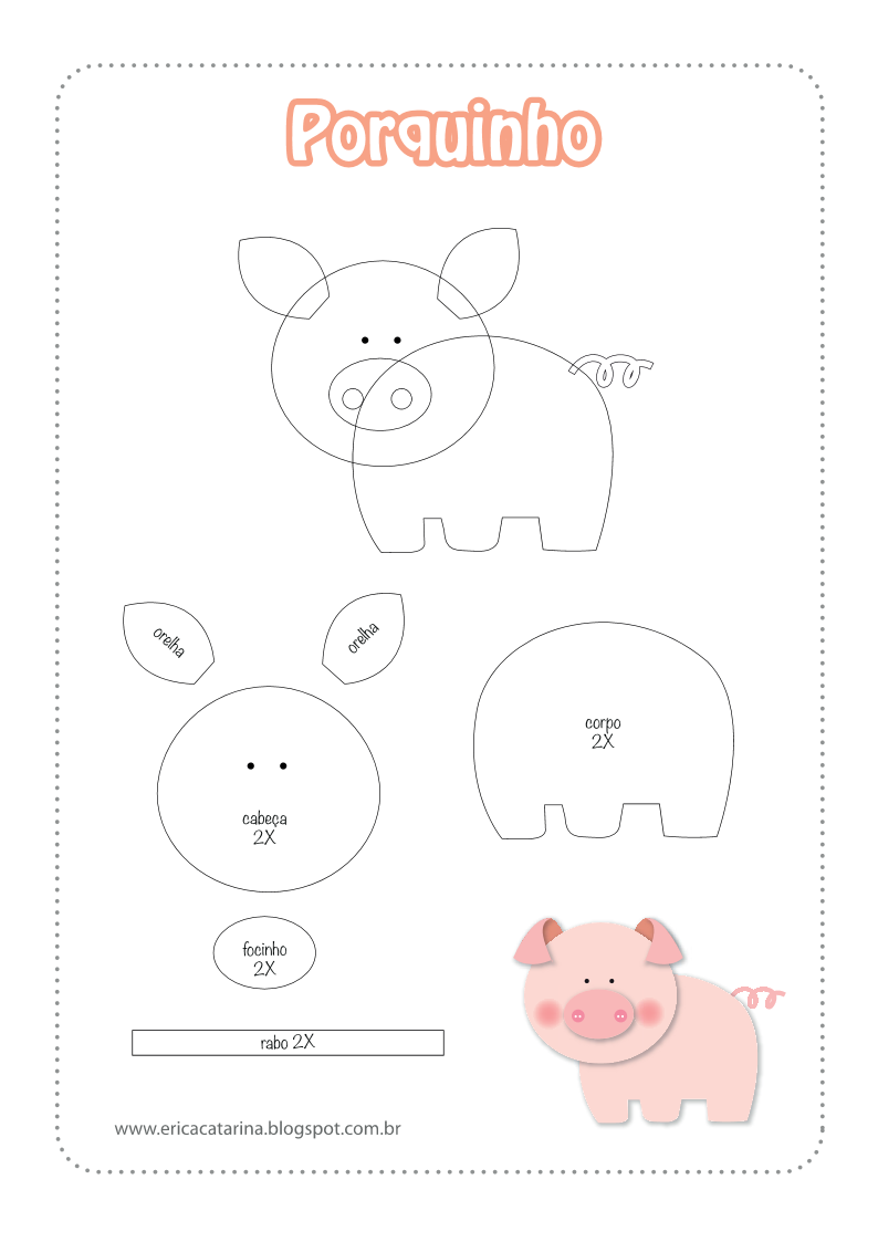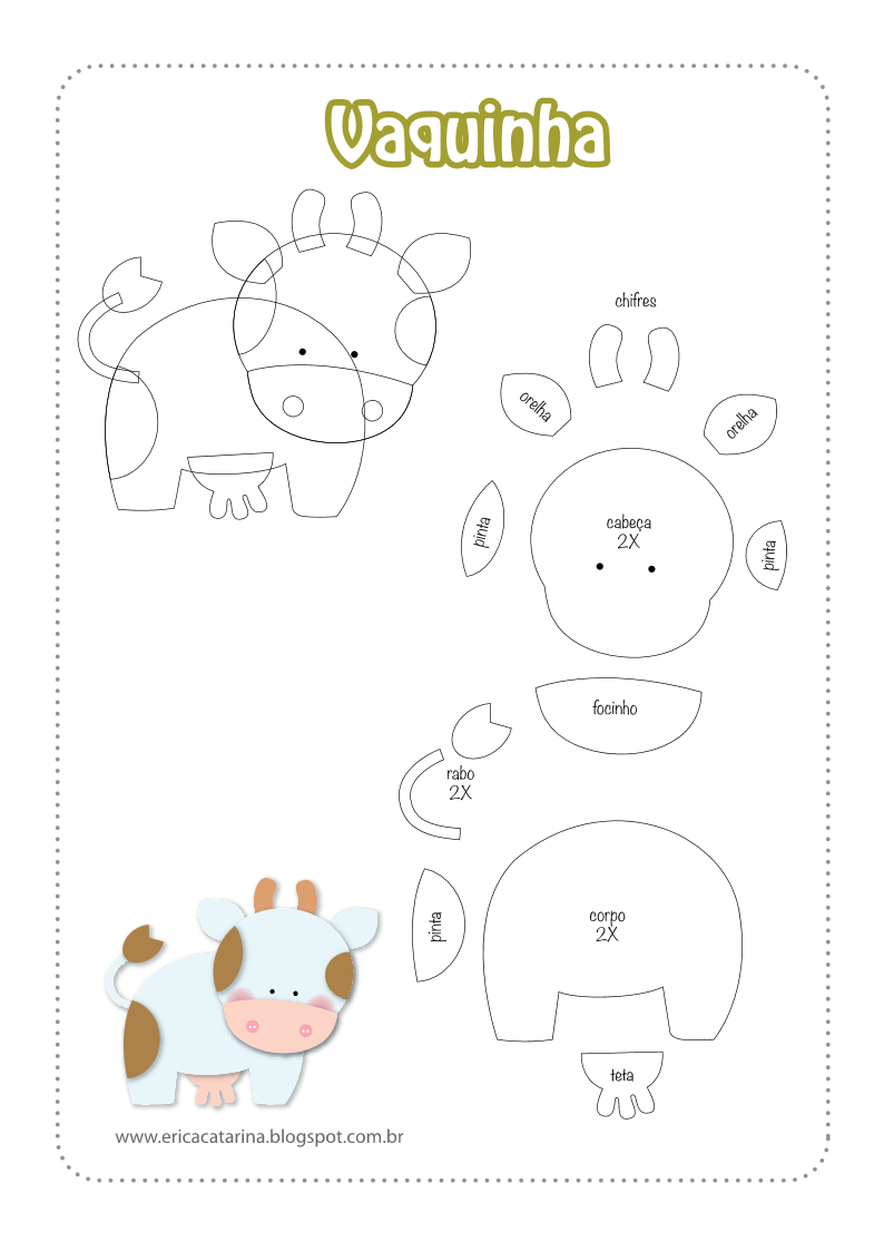 Moldes de feltro: elefante, leãozinho, cavalinho, girafa, hipopótamo, macaquinho, passarinho, tigre, zebrinha, ovelha, pintinho, porquinho, vaquinha, galinha, gatinho e cachorrinho.