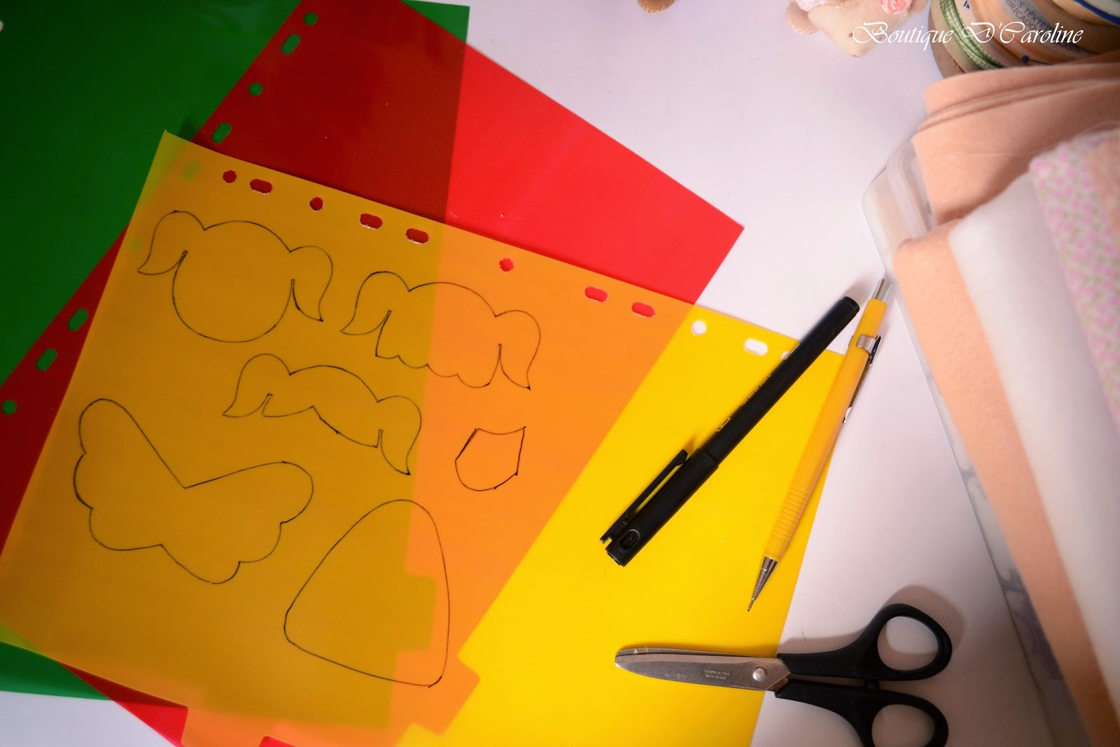 Costumamos desenhar o molde no papel sulfite. Acontece que o sulfite é muito fino e usá-lo para riscar as peças do trabalho a ser feito, tanto no feltro como no tecido tecido não é agradável e nem funcional. É preciso de algum material mais firme. Muitas artesãs usam radiografias para isso. Mas nem sempre temos um plástiquito daqueles em casa. A autora usa divisórias de fichário. Essas divisórias são firmes e fáceis de achar em qualquer papelaria mundão a fora. Algumas divisórias são fáceis de riscar com lápis ou caneta. Mas outras não. Pra isso, temos a caneta de escrever em CD's, aquelas permanentes.