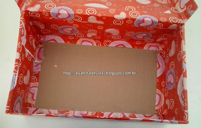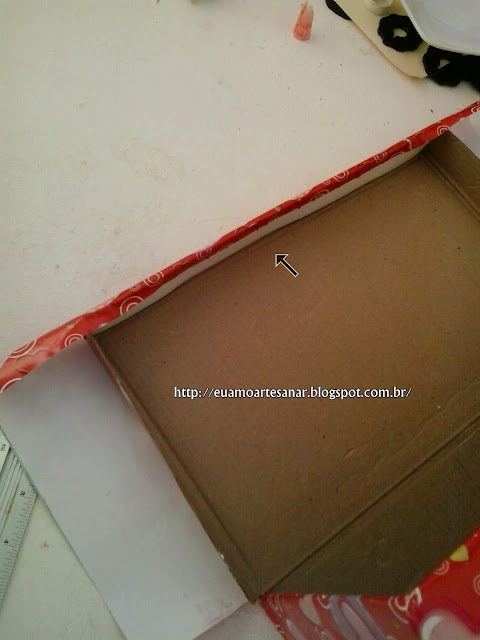 Pronta a tira para fazer o acabamento de dentro da caixa, fui colocando o papel(está no avesso) em toda a volta da caixa e dobrando em cada ponta