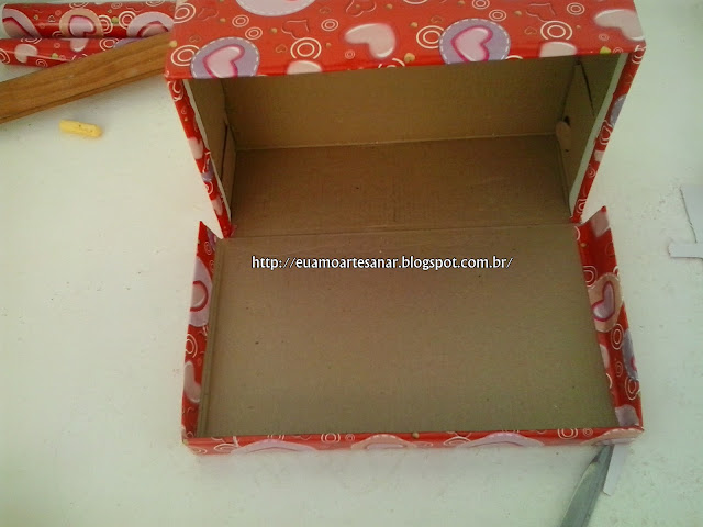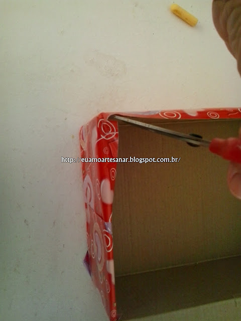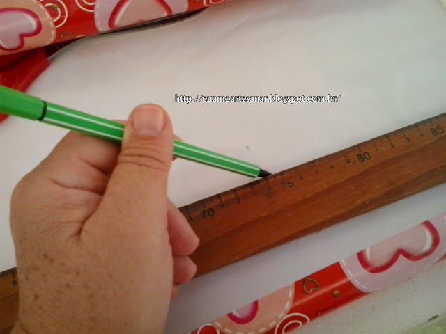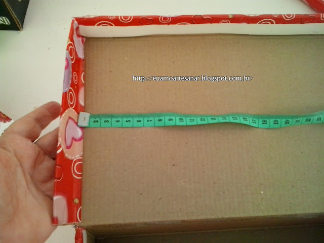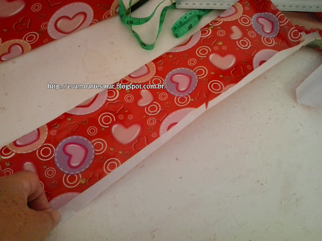 A altura da minha caixa é de 10cm, cortei com 12cm(para o acabamento), usei a régua para cortar