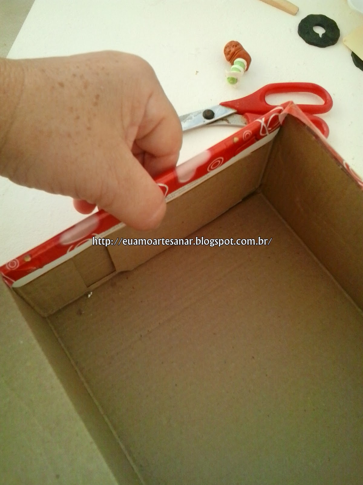 E vamos colar a tira, encaixando-a certinho (nas dobras que fizemos em volta da caixa)