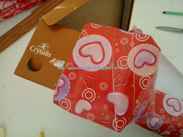 E comece a colar na lateral da caixa tomando o cuidado para que fique bem retinho