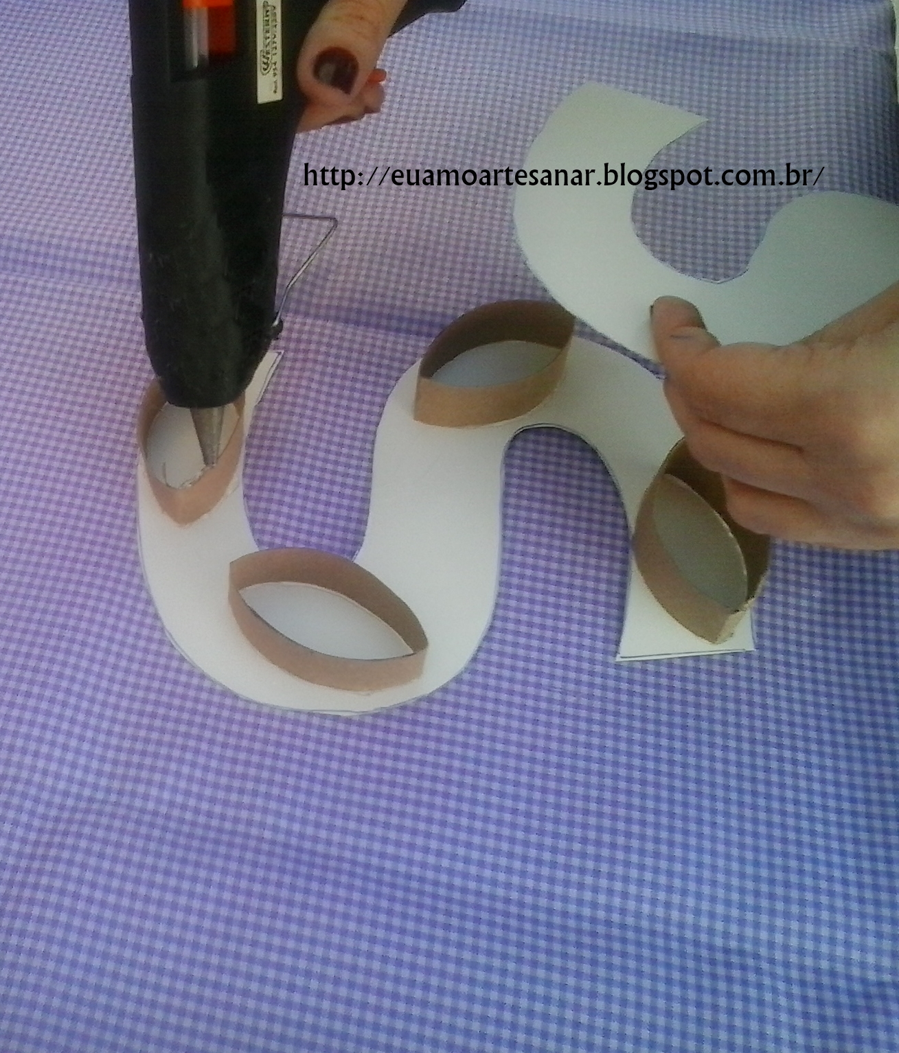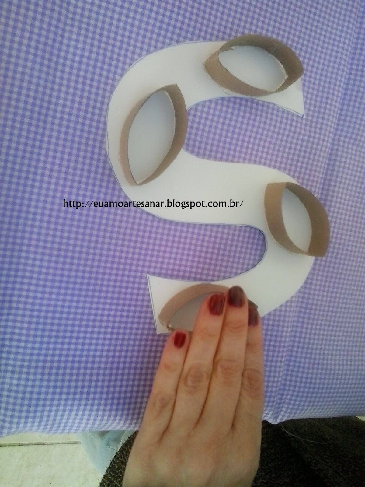 E cole a tirinha delicadamente para que não fique torta, não esquecendo que o rolinho de papel higiênico recortado está com 2cm e a tirinha de eva está com 3cm, então temos 1cm a mais que depois será recortada essa rebarbaVai colando toda a tira de eva até terminar toda a volta da letra