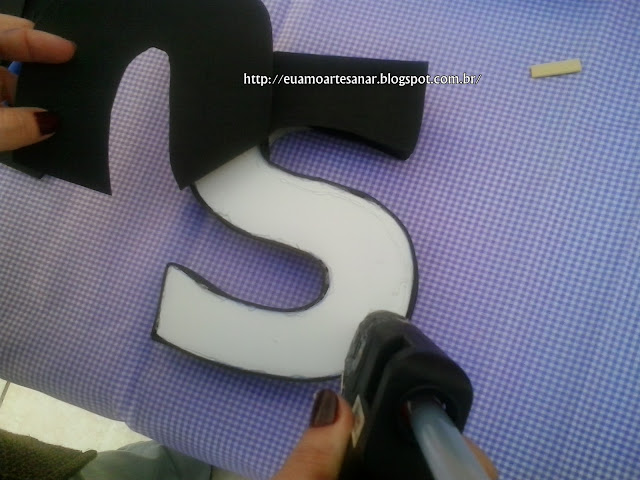 Depois de pronta toda a volta da letra, recorte toda rebarba, bem rente(se lembra que falei lá em cima que o eva estava com 1cm a mais? é hora de tirar)