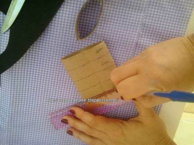 Pegue o rolinho de papel higiênico e de uma leve achatada e meça com a régua 2cm e risque(todo ele, como mostra a figura abaixo)