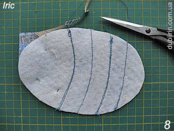 Nós combinar as arestas de peças utilizadas e as tiras azuis, prendendo-as com pinos perpendicular à linha de costura e abrindo a uma distância de 0,5 cm da borda. Detalhes sostrachivayutsya simultaneamente uns com os outros e costurar para a base.