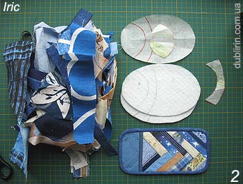2. Se você estiver indo para tornar este um kit de maquiagem, como eu fiz, em seguida, colocar na frente de todos os tecidos e um objeto do kit (eu estava pronto ocheshnik), e pegar a necessária gama de Patchwerk.