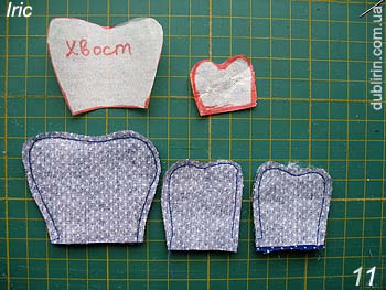 um. "Cabeça" feitas usando partes do padrão e um documento denso. Anexar um pino de segurança do padrão de tecido e corte detalhe e com margens de 0,5-0,7 cm. (Talvez, neste caso, o padrão seria conveniente usar papel para congelamento de produtos, que discutimos no fórum.)