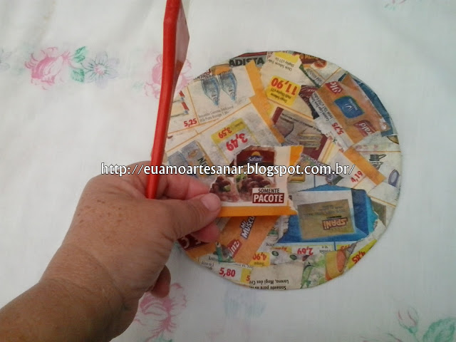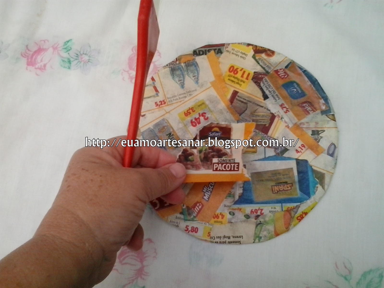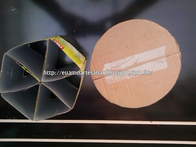 Agora vamos fazer a base do porta treco(como eu não tinha papelão inteiro tive que remendar um), medi com um pratinho que dava certinho o tamanho