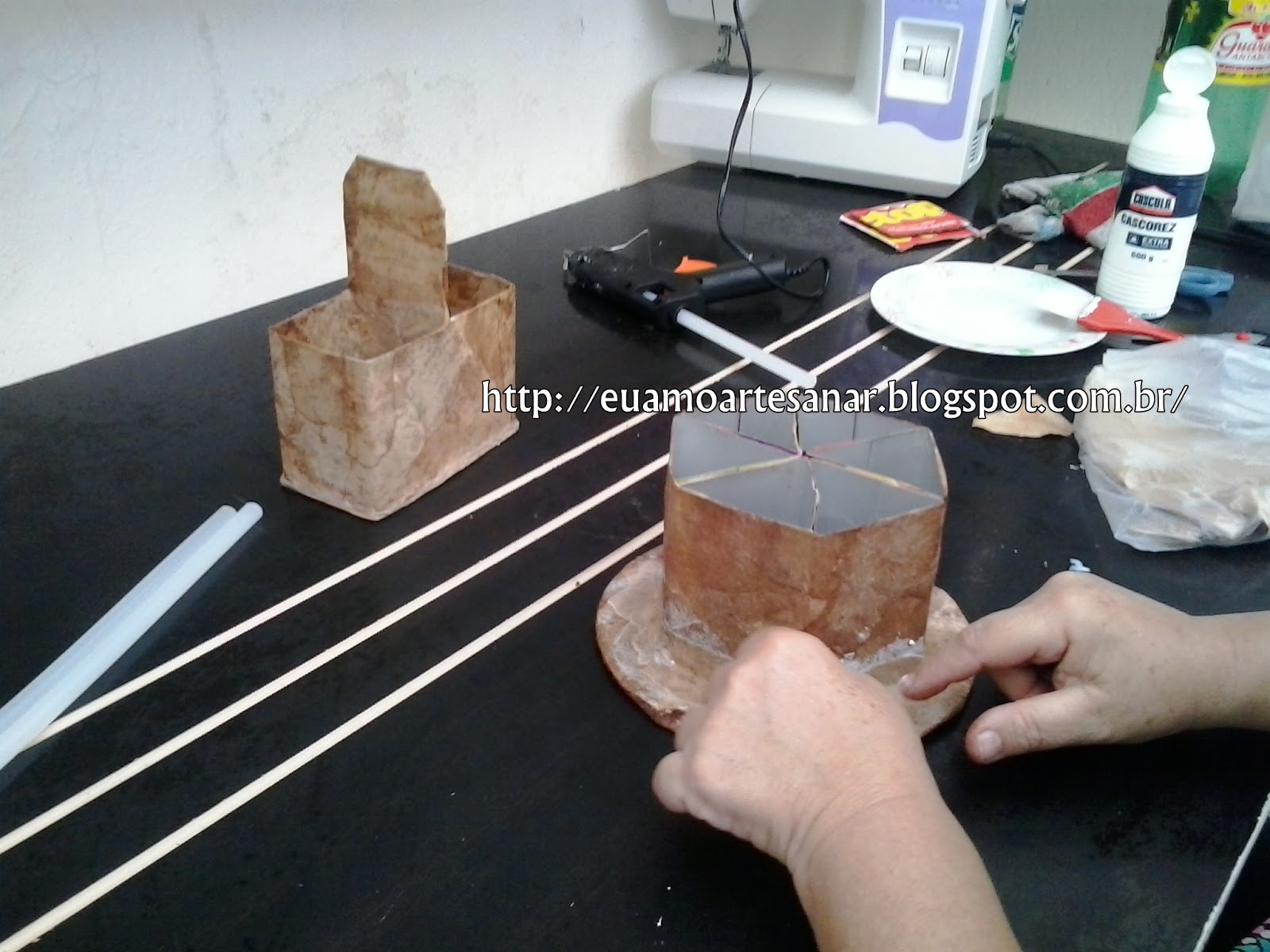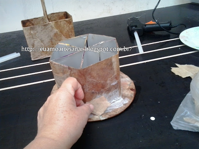 Depois passei novamente a mistura de cola com água e colei os filtros rasgados em pedacinhos pequenos para esconder a cola quenteEm toda a volta