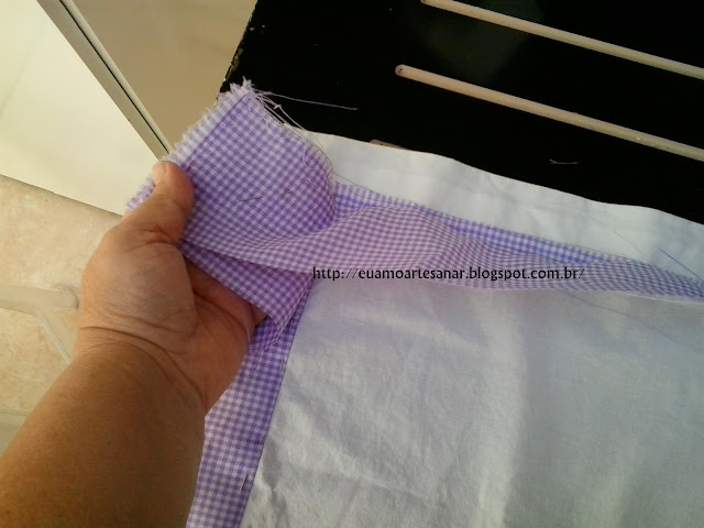 Coloquei o paninho branco por cima do xadrez e virei as pontas fazendo uma barra