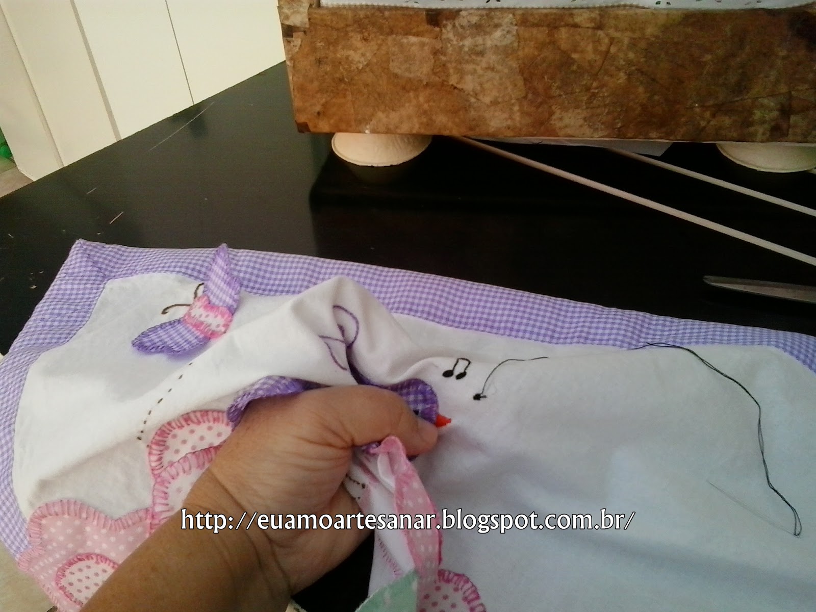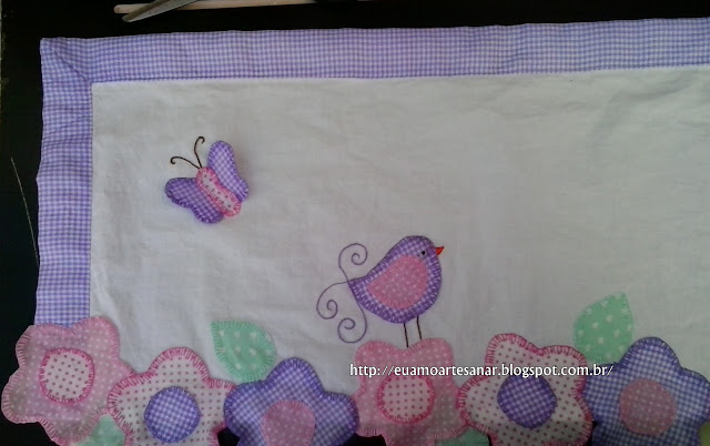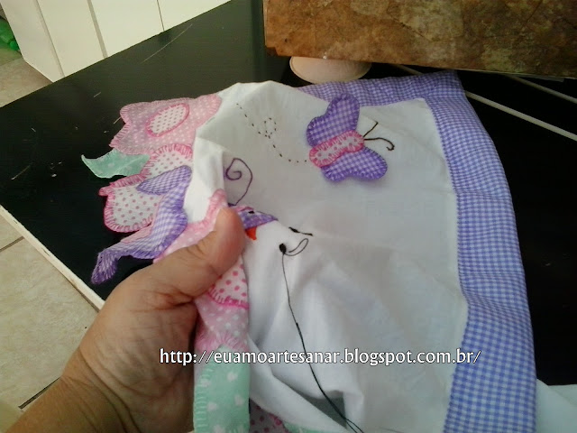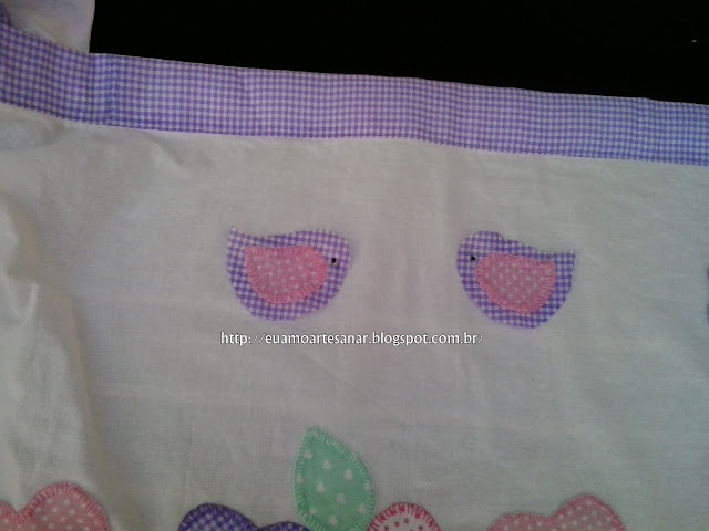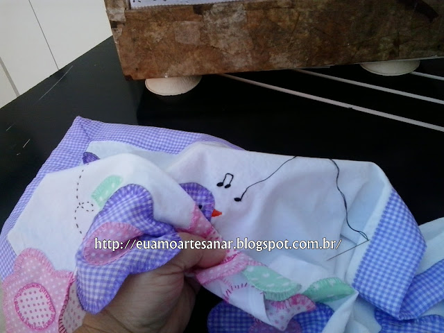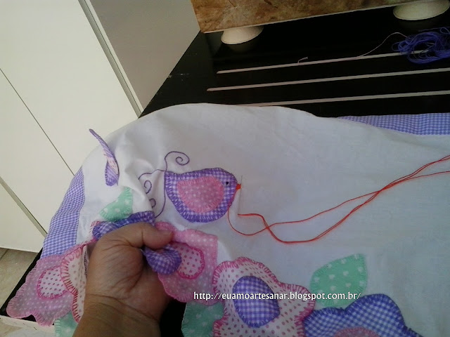 E bordei com ponto atrás enfiando a agulha por dentro do passarinho para começar a bordar para não aparecer o nó