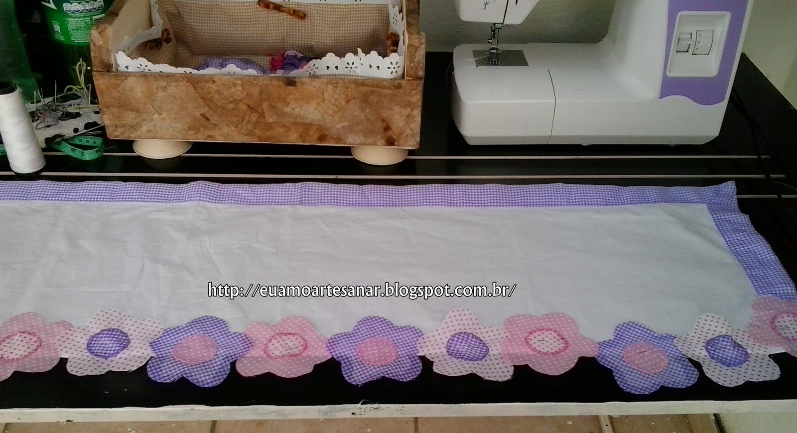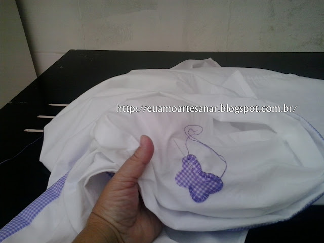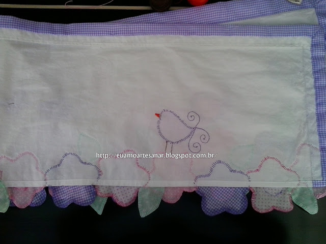 Por falar em artesanato, estou começando a fazer uma cortina para o quartinho de minha netinha Carla de 4 anos. Para eu ter ideia, olhei cortinas na internet, e resolvi fazer um bandô com patch aplique, fiz assim, quer ver?