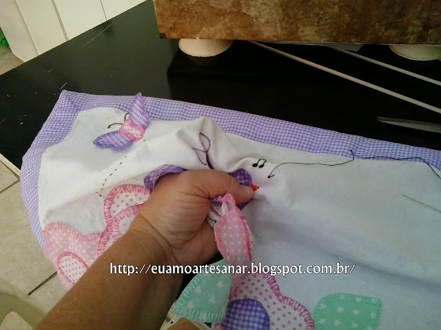 Dispus a borboleta e o passarinho e caseei(aqui já é outro passarinho que usei, porque tinha caseado toda a sua volta e não tinha como prender no bandô. Este aqui, primeiramente caseei só as asas e depois caseei toda a volta dele prendendo no bandô)