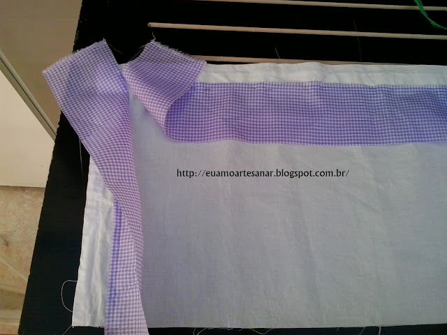 Agora vamos fazer o bandô da cortina, cortei o bandô no tecido branco 1.30cm de largura por 32cm de altura e cortei tiras de tecido xadrez roxo de 8cm de largura