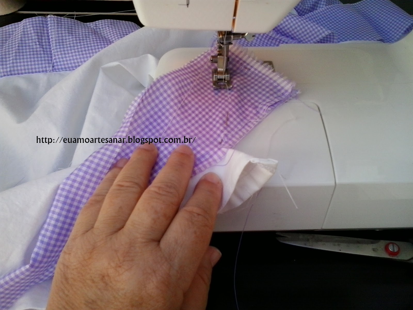 Ele existe em metal ou em plástico e alguns modelos de máquina de costura vêm com ele de fábrica. A artesã tem uma Singer Quantum 9940 que veio com um de metal, mas prefere mesmo o de plástico, que permite uma visualização ainda melhor.