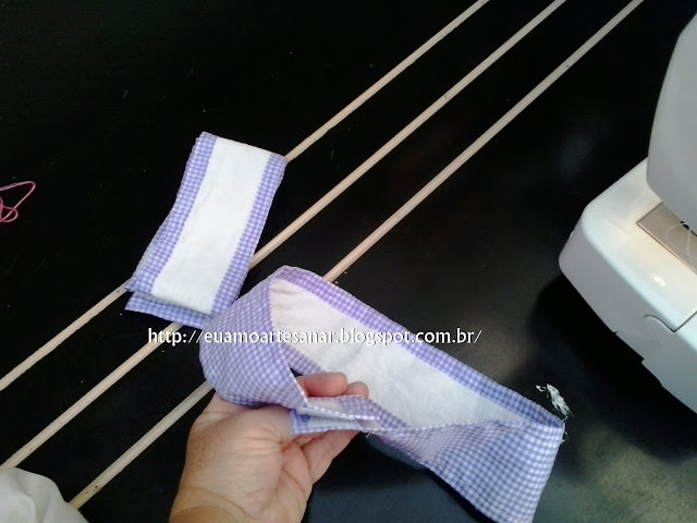 Fiz novamente tiras com o tecido roxo, que é a cor que predominou a cortina, de 8.5cm de largura