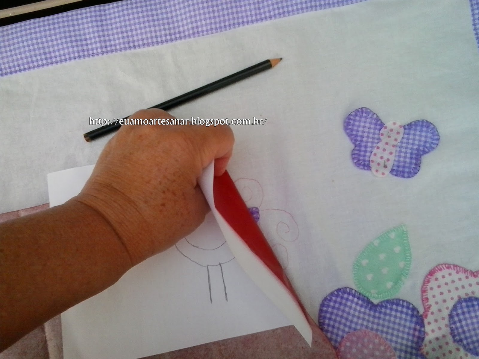 Pode ser feita à mão ou à máquina. E utiliza, além dos tecidos, o papel termocolante.