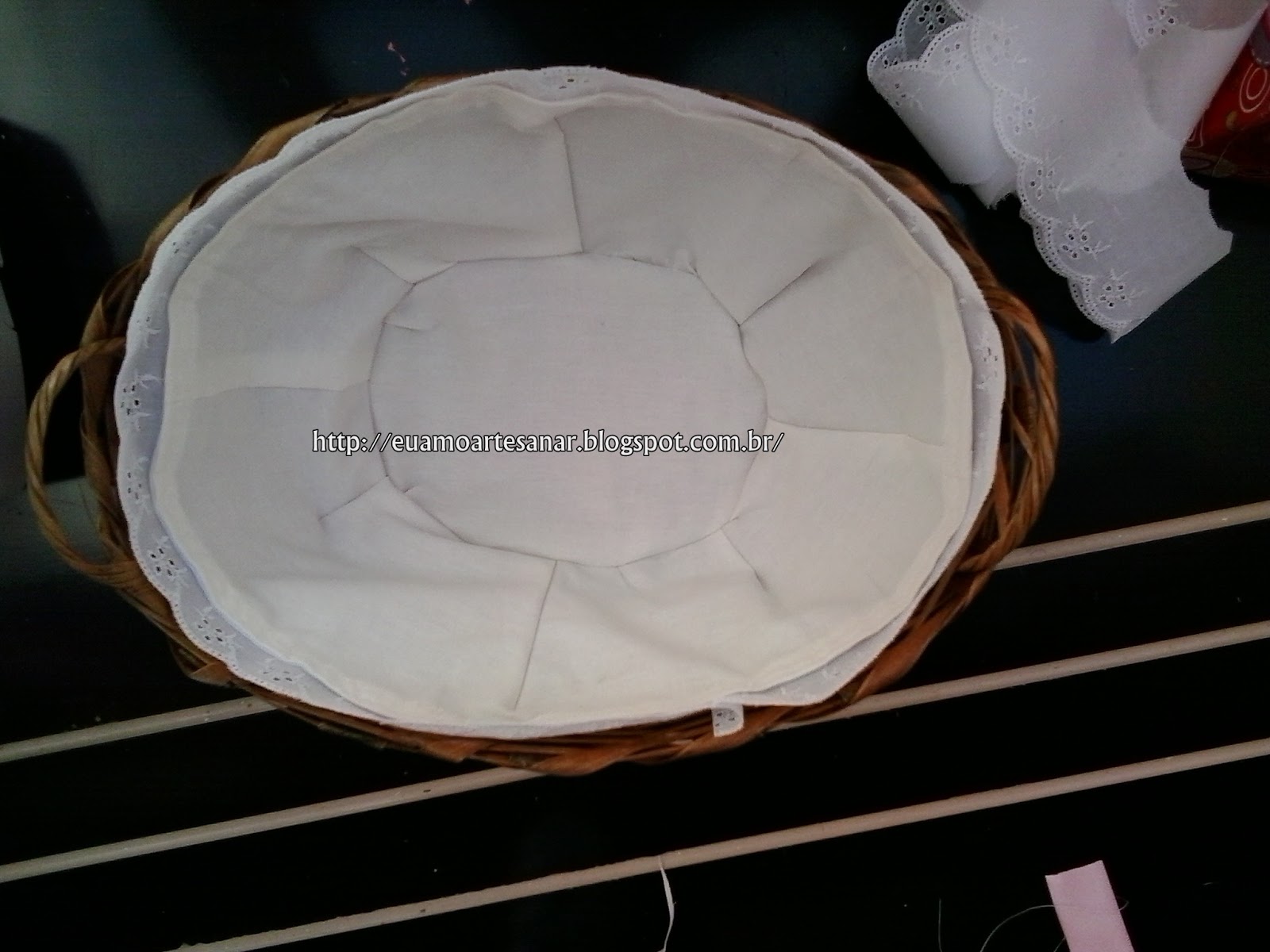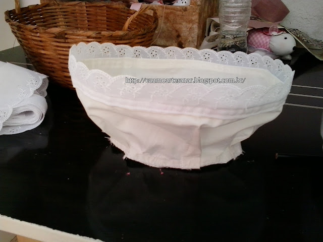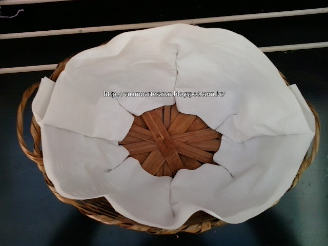 Tempos atrás viajei para São Lourenço e comprei 2 cestinhas de vime bem baratinhas, e resolvi fazer alguma coisa com elas. Cestinho de pão para quando viesse as visitas, ficaria bem bonitinho, então fiz assim: Cortei papel de costura mesmo(não tinha outro) e fui ajeitando na cestinha para fazer um molde