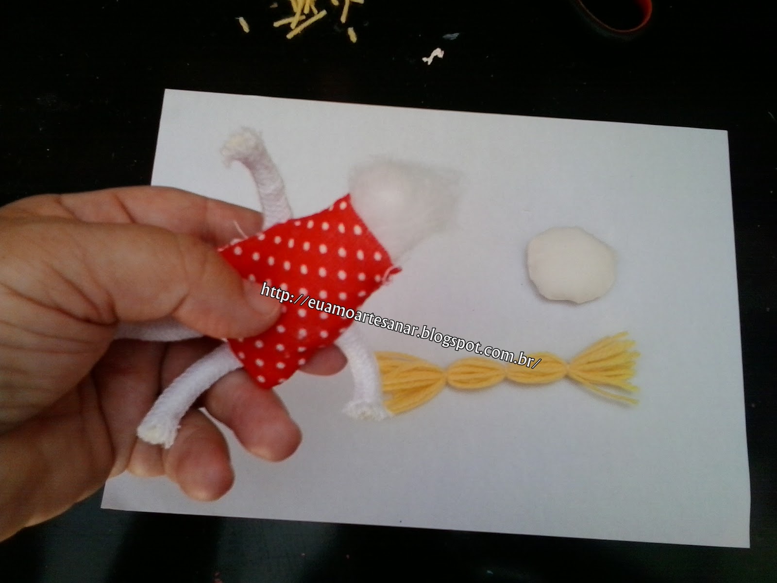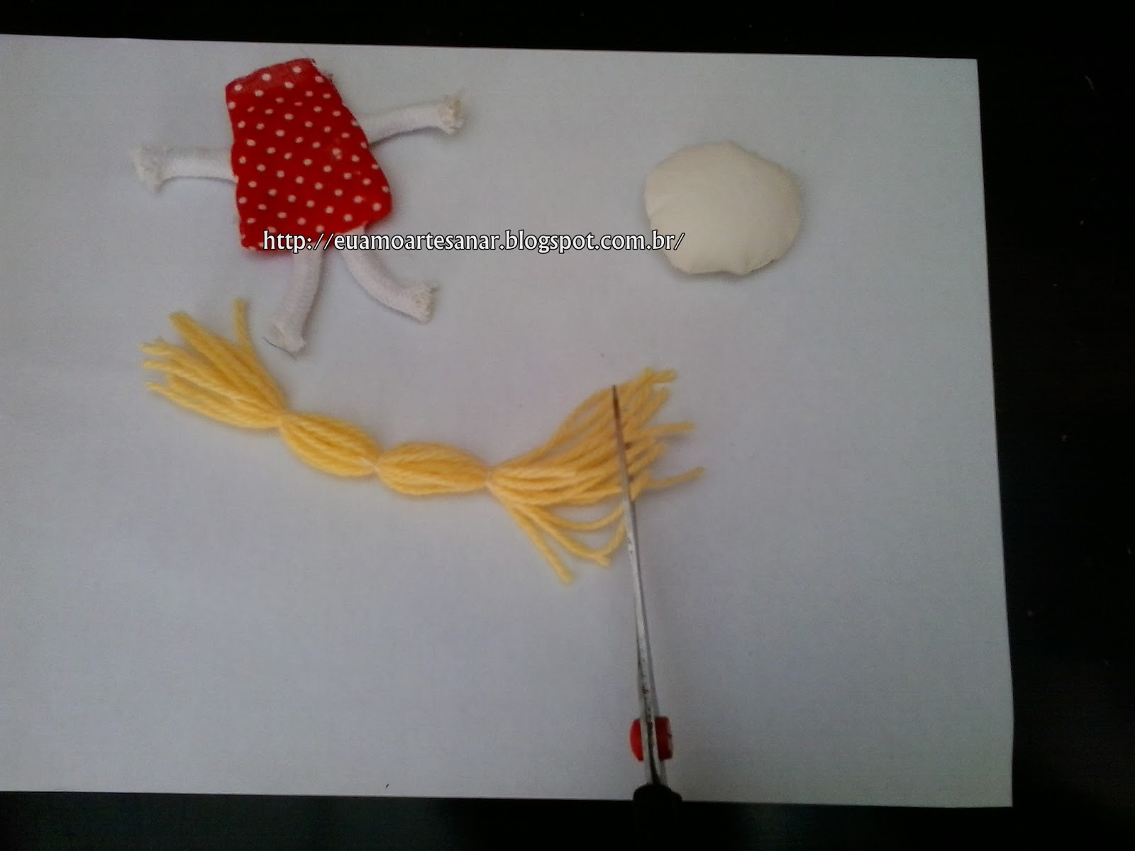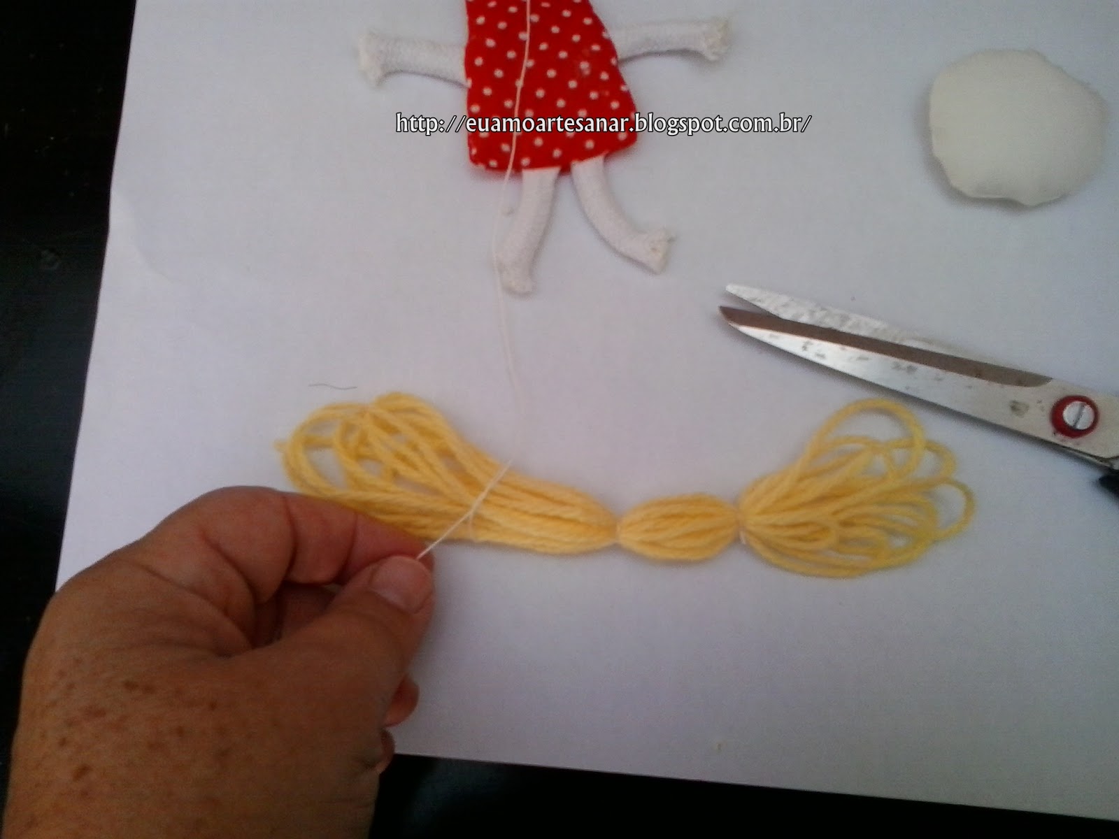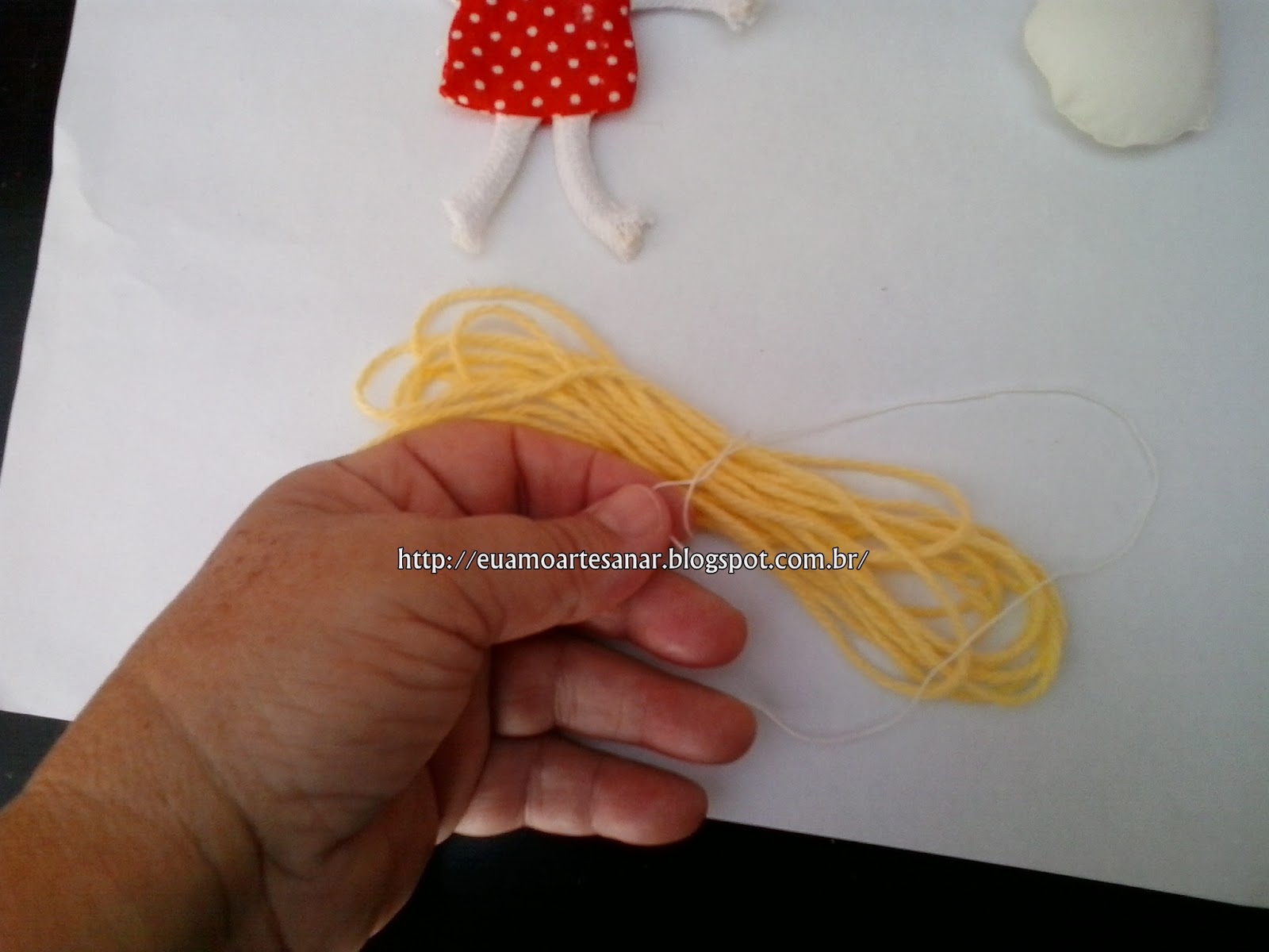 Agora vamos fazer o cabelinho. Amarre um tufo de lã bem no meio