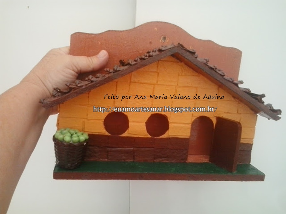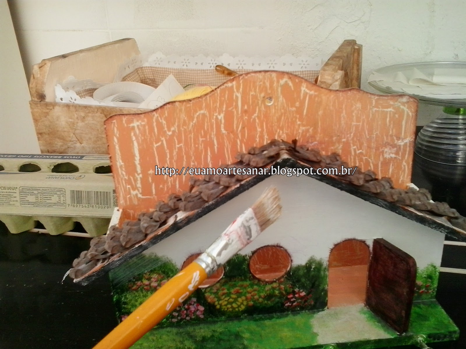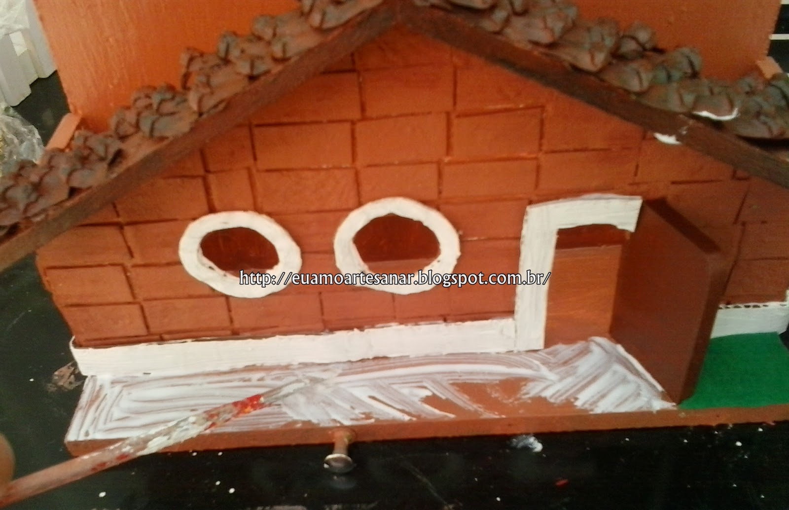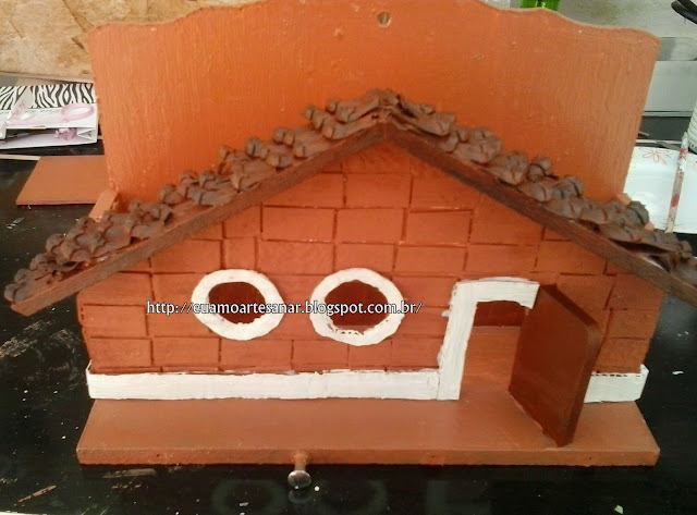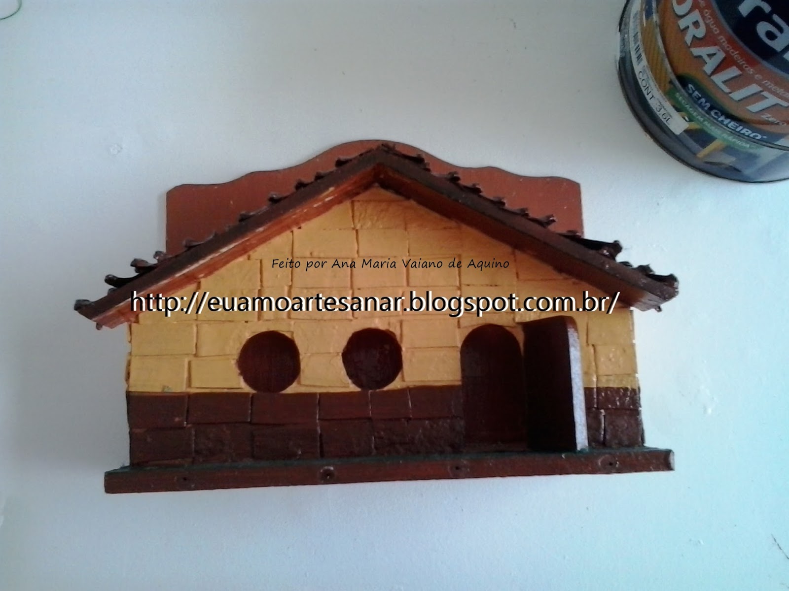 Coloquei os quadradinhos em toda casinha e passei tinta jatobá (falar a verdade, como eu não tinha tinta para artesanato, passei tinta para tecido, mas, não façam isso! só se você tiver prática com tintas)