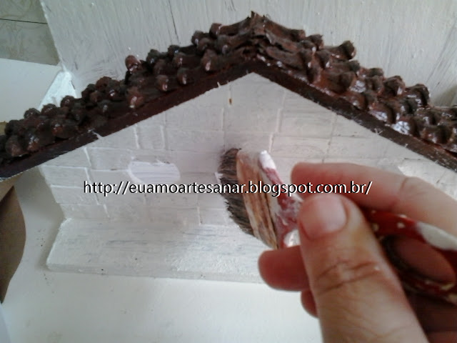 Passei duas mãos da tinta jatobá em toda a casa e no telhadinho passei tinta marrom e depois só sujei o pincel de tinta preta e passei no telhado já pintado de marrom. Veja imagem abaixo.