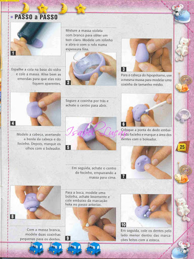 - Espalhe a cola atrás da cabeça e cole-a no pote, sobre a base feita em biscuit.