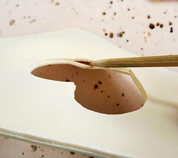 A casinha merece um capricho especial: sombreie as laterais (não há necessidade de sombrear o teto porque vamos colar o telhado sobre ele), sombreie o coração e, com um pincel de cerdas mais firmes, pinte a parte interna do recorte usando o mesmo tom.