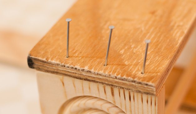 Passo 3: O prego no escudo e adicionar mais cola. A cavilha vai para a frente do organizador, o 2 "x 24" tira de madeira (placa traseira) para a parte de trás.Coloque uma camada fina de cola de madeira nas superfícies que tocarão, em seguida, usar três dos pregos de acabamento para fixar a placa de volta para uma roseta em cada lado. A cola e as unhas vai dar mais estabilidade.