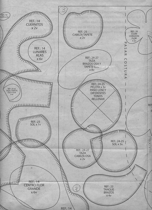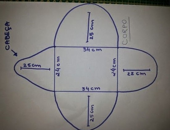 (1) Dobre o tecido ao meio e disponha os moldes do corpo, das asas e os dois do rabo.