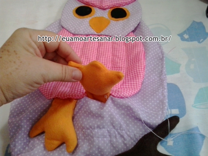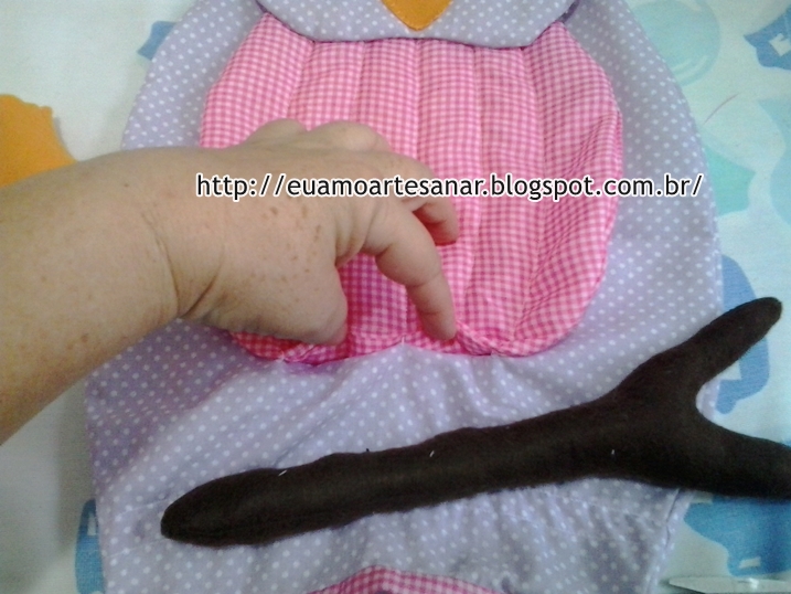 E costure o galho nos pés da coruja, veja a imagem abaixo, não costure no saco do puxa saco